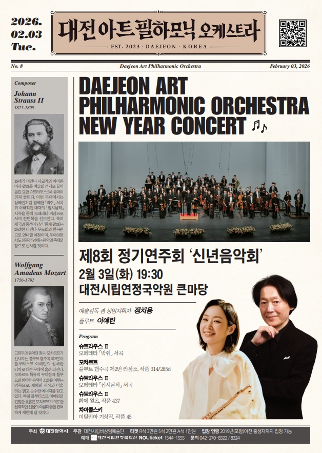 대전아트필하모닉오케스트라(이하‘대전아트필’)가 2월 3일(화) 오후 7시 30분, 대전시립연정국악원 큰마당에서 제8회 정기연주회‘신년음악회’를 개최한다. 이번 연주회는 1월 초 공개 오디션을 통해 선발한 39세 이하 지역 청년 음악가들이 하나의 오케스트라로 호흡을 맞추는 첫 공식 무대다. 대전아트필의 새로운 출발을 알리는 동시에, 이들이 그려낼 젊고 역동적인 음악적 방향성을 미리 엿볼 수 있는 소중한 기회가 될 전망이다. 지난해 총 24회의 공연을 성공적으로 마치며 지역 클래식 인재 양성에 기여해 온 대전아트필은 올해 역시 25회 이상의 공연을 기획하며 시민들과 더욱 가까이 호흡할 예정이다. 이번 연주회는 예술감독 겸 상임지휘자 정치용의 지휘로, 2026년 희망을 담은 화려한 프로그램으로 꾸며진다. 빈 신년음악회의 전통을 잇는 요한 슈트라우스 2세의 명곡부터 모차르트, 차이콥스키의 걸작까지 폭넓게 아우른다. 첫 무대는 슈트라우스 2세의 오페레타 ‘박쥐’서곡으로 경쾌하게 문을 연다. 이어 한국예술종합학교 교수이자 국내외에서 활발한 활동을 펼치고 있는 플루티스트 이예린이 협연자로 나선다. 모차르트의 ‘플루트 협주곡 제2번 라장조’를 선보이며 이예린의 섬세한 음악적 표현력으로 모차르트만의 특유의 매력을 선사할 예정이다. 2부에서는 슈트라우스 2세의 이국적인 색채가 가득한 오페레타 ‘집시남작 서곡’과 웅장하면서도 품격이 있는 ‘황제 왈츠’가 이어지며 분위기를 한층 더 끌어올릴 것이다. 마지막은 차이콥스키의 ‘이탈리아 기상곡’으로 장식한다. 이 곡의 역동적인 관현악법은 대전아트필이 새롭게 내딛는 눈부신 여정을 상징적으로 보여줄 것이다. 대전아트필 관계자는 “이번 신년음악회는 시민들께 클래식의 아름다움을 전함과 동시에, 새롭게 구성된 대전아트필의 젊은 에너지를 증명하는 시간이 될 것”이라며 기대감을 전했다. 연주회에 대한 자세한 사항은 대전시립예술단 홈페이지에서 확인할 수 있으며 기타 문의는 대전시립예술단 비상임예술단(☎042-270-8322)으로 하면 된다.