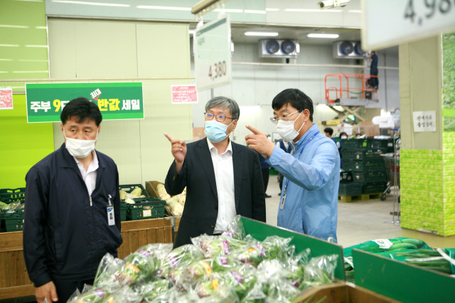 왼쪽부터 농협유통 강호성 전무이사, 조재호 농림축산식품부 차관보, 농협유통 양시춘 양재지사장이 하나로마트 양재점의 농축산물 소비 촉진 현장을 찾아 주요 농축산물의 수급 동향 및 물가를 점검했다
